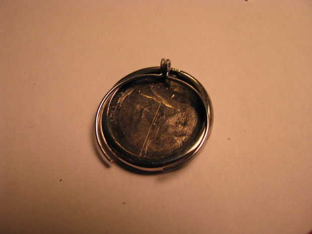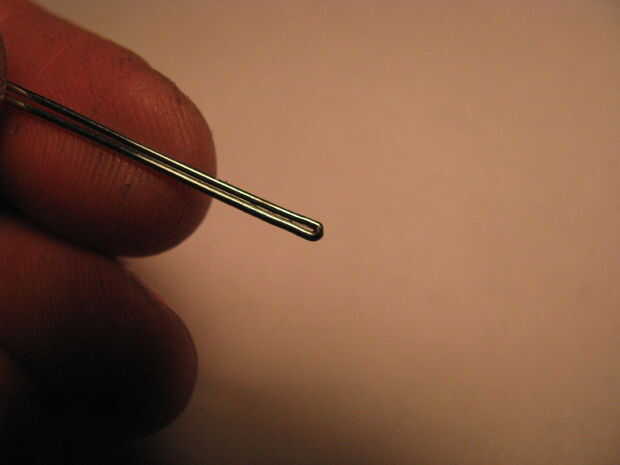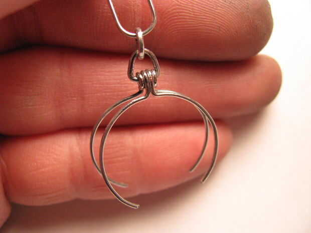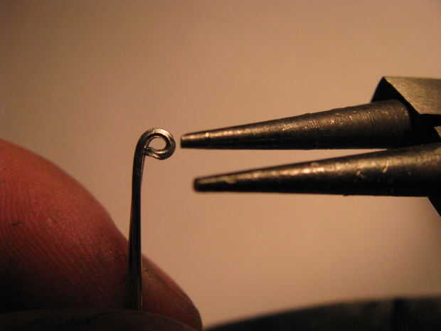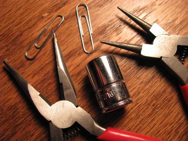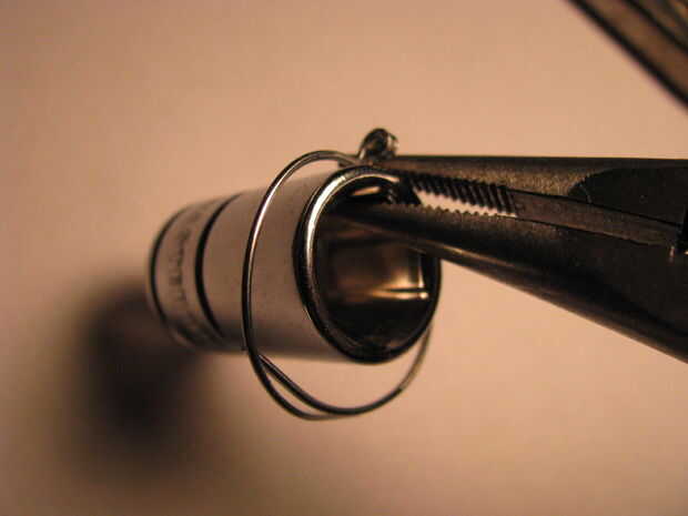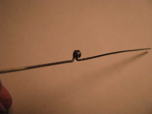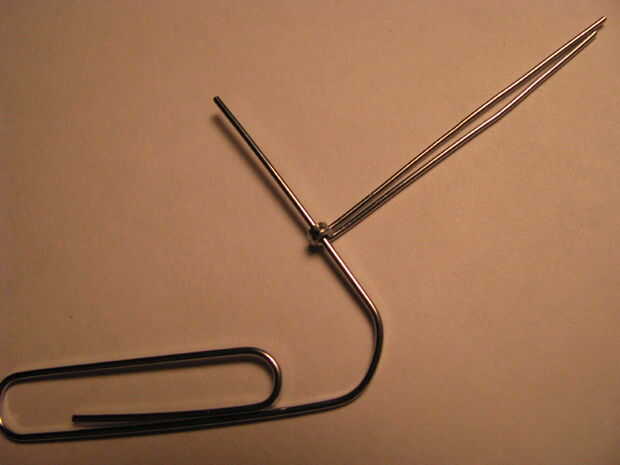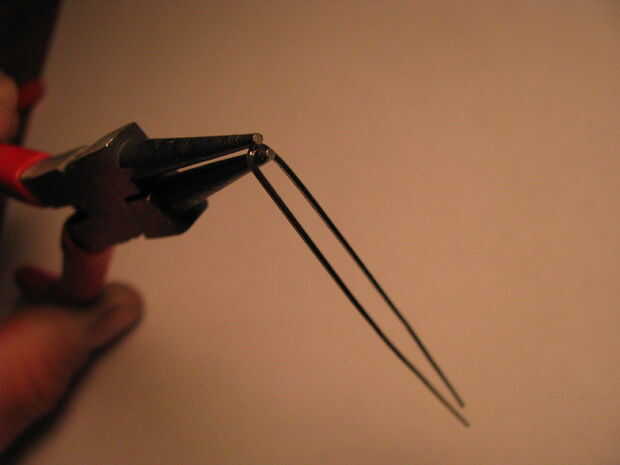 Parte uno: extender un clip de papel y dóblalo por la mitad. Alicate doble completamente el cable. Enrolle el extremo de la cara arrugada con alicates de punta redonda. Inserte un trozo de alambre de calibre más grueso a través del lazo. Utilice pinzas para trabajar el lazo más pequeño alrededor del alambre. Splay los cables apartes por lo que están doblados a 180 grados unos de otros. Utilice el toma para doblar los extremos libres en un círculo. Ver las fotos.