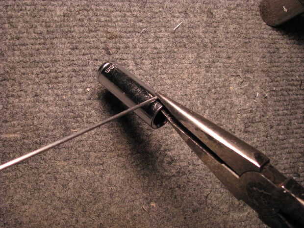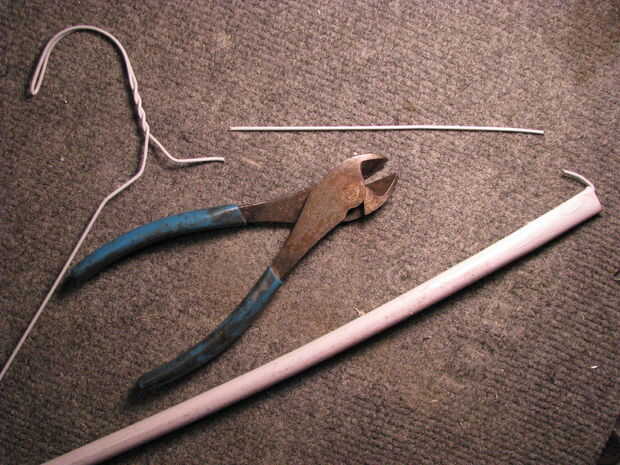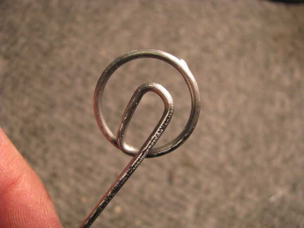 Corte una sección de alambre de un colgador de ropa. Raspe cualquier revestimiento del cable. Mediante una toma de corriente, formar un anillo. Doblar el extremo de la cola del alambre hacia el centro del anillo. Forman una "U" en el extremo de la cola. Corte el exceso de la forma de alambre para que se ve como se muestra.