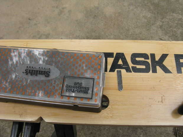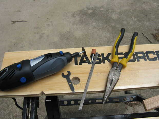 Después de tener tierra un bisel áspero a la hoja utilice la piedra de afilar para poner un borde mejor en él. Retire cualquier fresas restantes y medir el ancho de la cuchilla nueva. El mío es 1/4" por lo que tendrá un 1/4" broca para el siguiente paso.