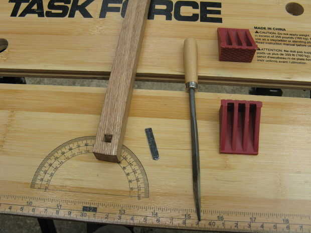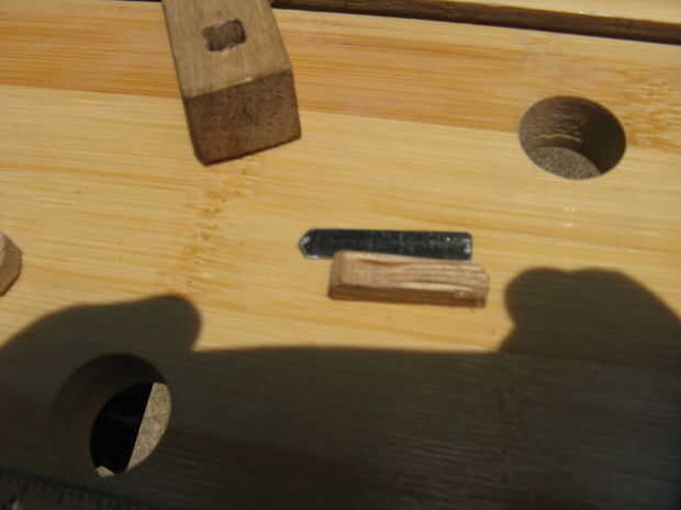 La cuña para sujetar la hoja en debe ser de 1/16"- 1/8" más corto que la hoja.  Debe ser 1/4 "x 1/4" cuadrado.  la parte inferior del chaflán con un archivo.  Luego sería tomar un avión de bloque y afeitar hacia abajo hasta que encaje perfectamente con la hoja en así.  La hoja y la cuña deben ser muy ceñidos.  En mi medidor tienes golpéelo ligeramente con un mazo para configurarlo.