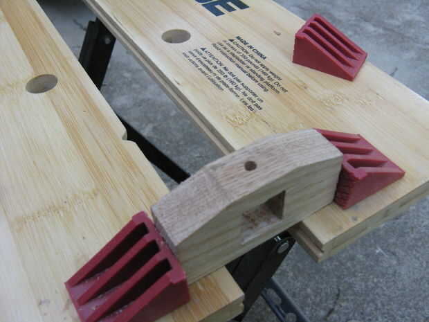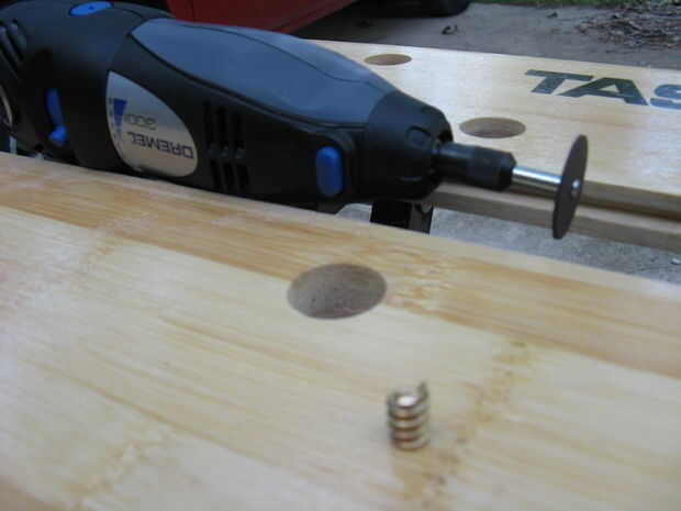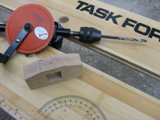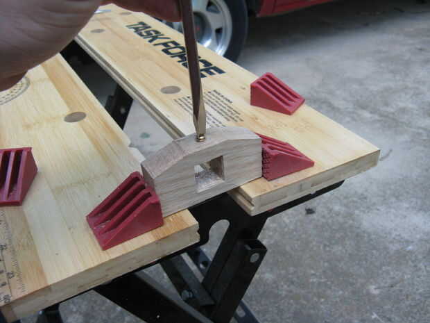 El taco cuadrado y eliminar el centro de la parte superior.  Controlar la broca contra la tuerca insertable a leña para asegurarse de que es del mismo tamaño (el mío era 3/8") luego perfore un agujero (Verifique que el taladro es recto, no hice esto y mi tornillo moleteado se inclina hacia adelante).  Siguiente tornillo la madera Inserte la tuerca en el agujero para pasarlo.  Luego retirarla y cortarla por la mitad con un dremel y una muesca en la parte superior con una dremel así que usted puede atornillar de nuevo en.  De esta manera habrá espacio para un pad de espiga para proteger la espiga cuadrada de la fuerza del tornillo moleteado.