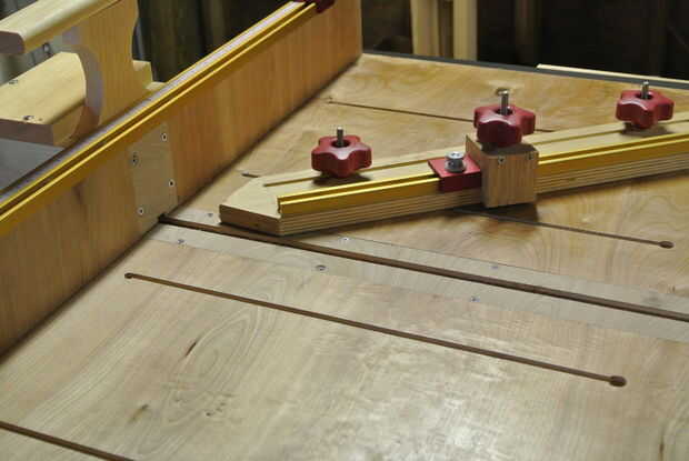 También he añadido mi barra de ingletes de mi otro trineo. Usando las pistas de la T en el trineo, se puede definir a una multitud de diferentes ángulos para cortes de ingletes y cortes de inglete compuesto. También he instalado una pista de T en la parte superior de un bloque de tope.