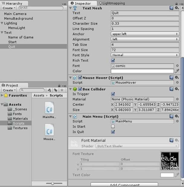 Añadir el script del menú principal a cada uno de los objetos del texto 3D que sirven como botones.