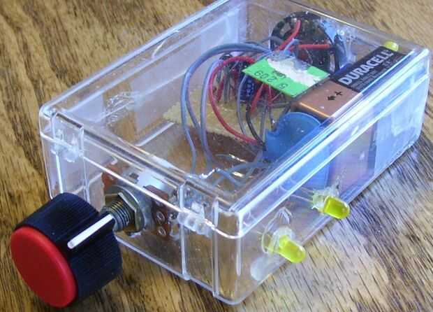 Tiene dos LEDs y un altavoz. Para cada golpe, hace clic y cambia el LED que se ilumina. Controlan la velocidad de los beats con una esfera.