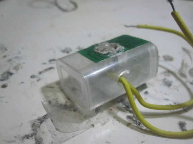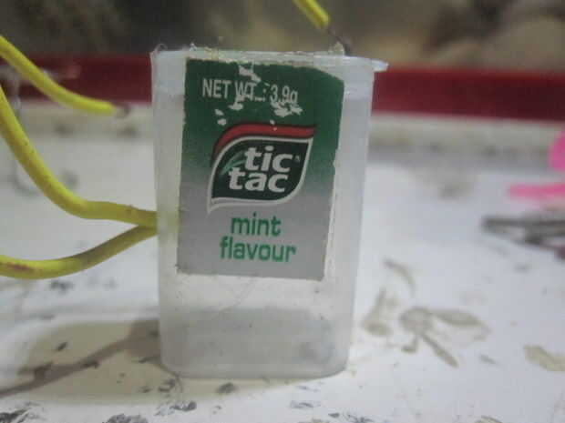 Añadir el LED (conectado con cables) dentro de la caja de Tic-tac, con los alambres que sobresalen del agujero lateral y el LED en el agujero anterior.