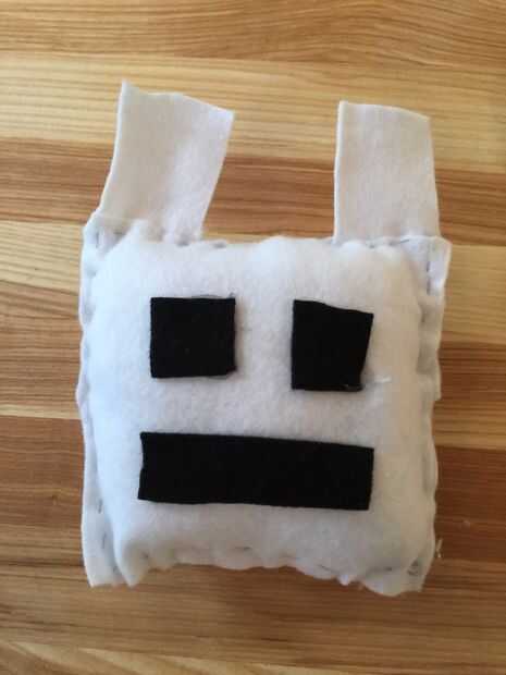En primer lugar, casi coser las 2 piezas más grandes de fieltro blanco juntos a lo largo de las costuras, para hacer la cabeza. ASEGÚRESE DE QUE LOS OÍDOS SE ALLÍ TAMBIÉN. Luego llenar con relleno (pero no demasiado lleno) y el final de las puntadas. Una vez que hayas terminado con eso, simplemente pegamento las piezas negras en la frente para hacer la cara!