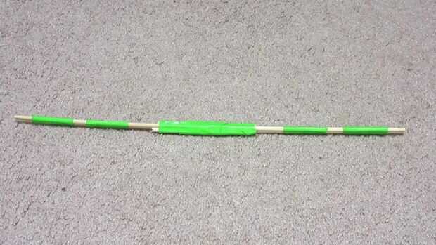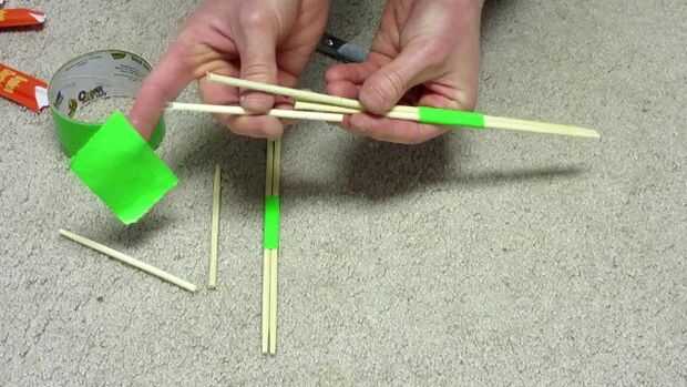 A continuación recortar 2 palillos más en el centro y guardar las mitades más gruesas. Se superponen sobre la mitad de las piezas recién cortadas en cada lado de una de las parejas originales. Y con cinta adhesiva firmemente en su lugar. Ahora deslice el segundo par para coincidir con el primero y en su lugar la cinta.
