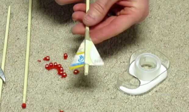 Tome el casquillo de una y cortarla en trozos individuales. Con cuidado deslice una tapa sobre el extremo de los palillos y cinta adhesiva en su lugar. Si desea puede agregar algunas plumas o alas en la parte posterior para la estabilidad en vuelo. Sólo cortar un pequeño triángulo de un cartón delgado y pegadas en su lugar.