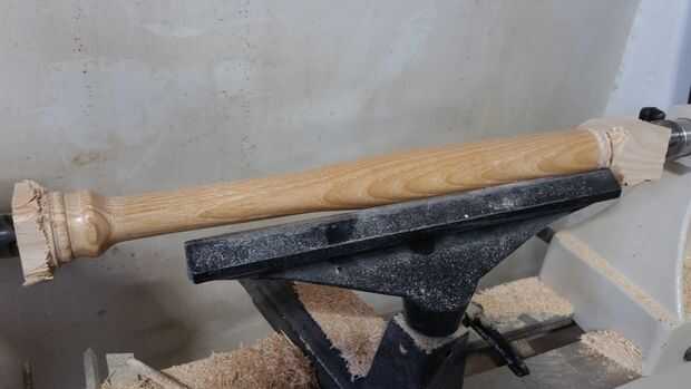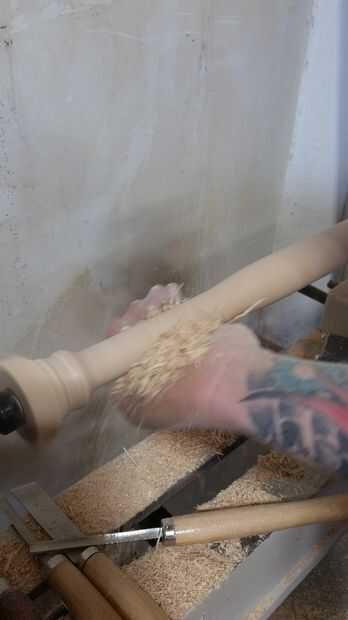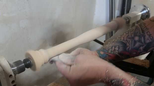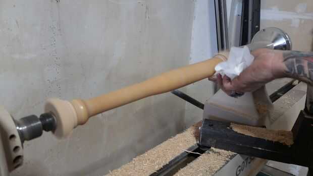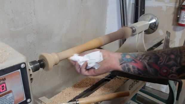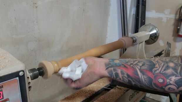 --Mientras que todavía está girando el torno Limpie la madera con el su trapo de uretano hasta el bate entero está cubierto uniformemente.