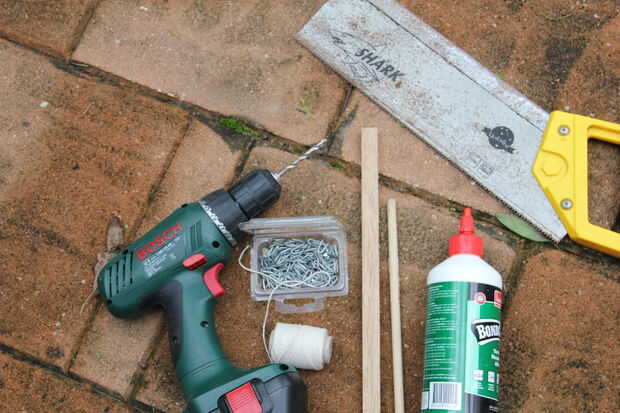 necesita: una sierra un taladro un taco una cosa larga de madera carne string (o cualquier otra cadena o una cadena pegamento para madera staples(or similar) madera