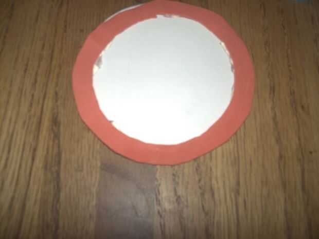 -En primer lugar pegar el círculo de espuma rojo grande en el círculo de la caja de cereal blanco grande.