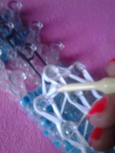 Now start from the end and grab the band to the right. Ahora empezar desde el final de nuevo y coge la banda a la izquierda. Empezar desde el final de nuevo y apoderarse de la banda a la mitad. Ahora en los tres suben como un solo triple. Asegúrese de que empuja a los triángulos. Ahora en el cruce de bandas derecho y gancho a la mitad. Lo mismo a la izquierda.