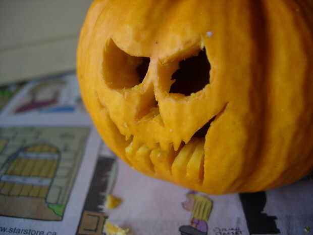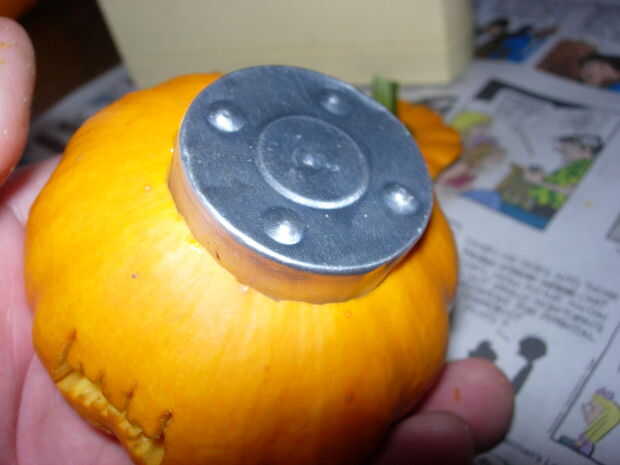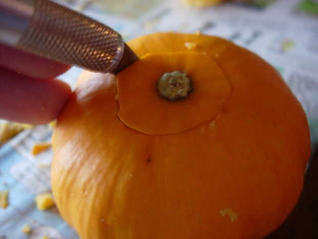 Mientras que esto necesita agarrar la calabaza hacerlo tenga cuidado no la rotura de la cara de la calabaza. Una vez que se corta la parte inferior, pueden ampliar al tamaño que necesitas. Si vas a poner una luz en el mismo que debe tener en cuenta que usted necesita cortar el aire del té los respiraderos en la parte inferior y superior de la espalda y que la calabaza que se arrugan muy rápidamente con el calor.