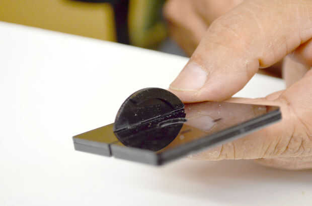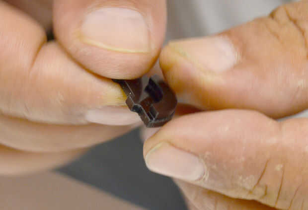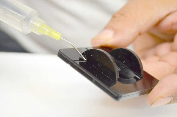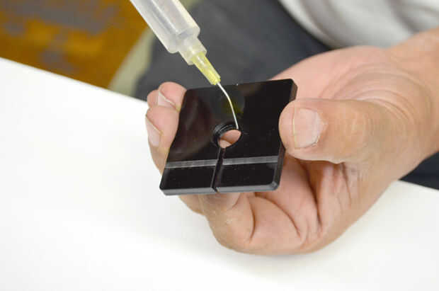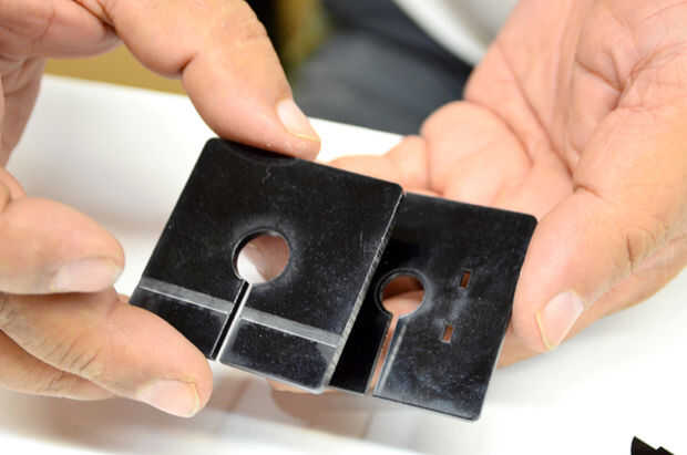 Alinear la inclinación apoyos con guías a lo largo de las líneas grabadas y pegamento en su lugar.