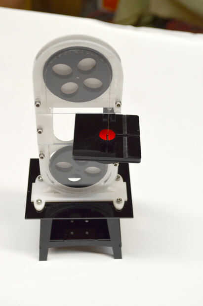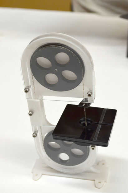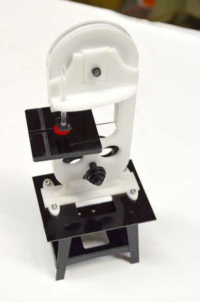 Ahora debe tener la sierra, la Base de la mesa, la mesa de corte y el protector rojo pequeño en frente de usted. Todo lo que sigue es poner a todos juntos.