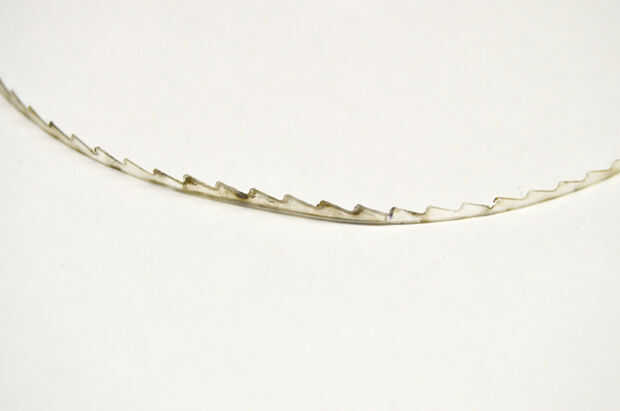 Envuelva la cuchilla alrededor de sí mismo y se superponen unos seis dientes, esta es la distancia aproximada alrededor de las ruedas en la sierra. Por esta razón el marco tiene una corredera para ajustar la tensión de la hoja.