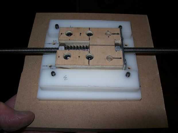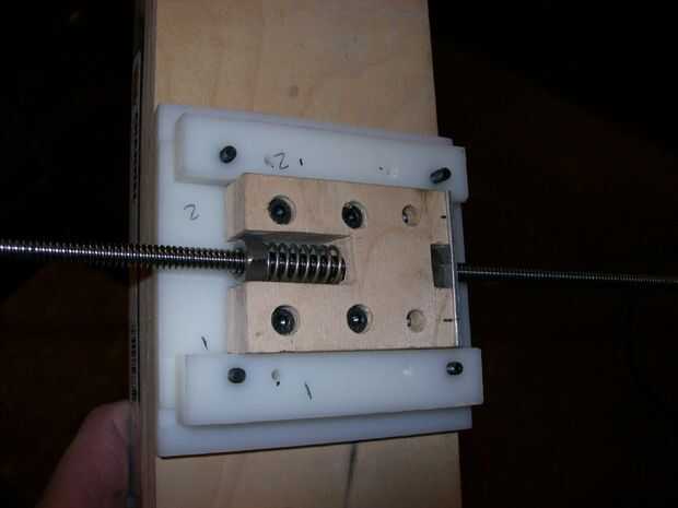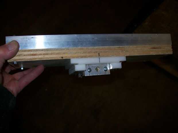 Monte la corredera de eje de X en la parte inferior de la del Y eje base placa de madera contrachapada (la parte que tiene los carriles de eje Y montados a él). Es muy importante que este montado centrado y cuadrados.