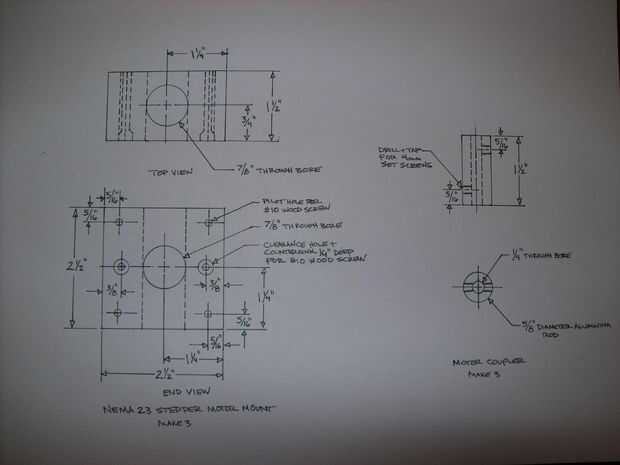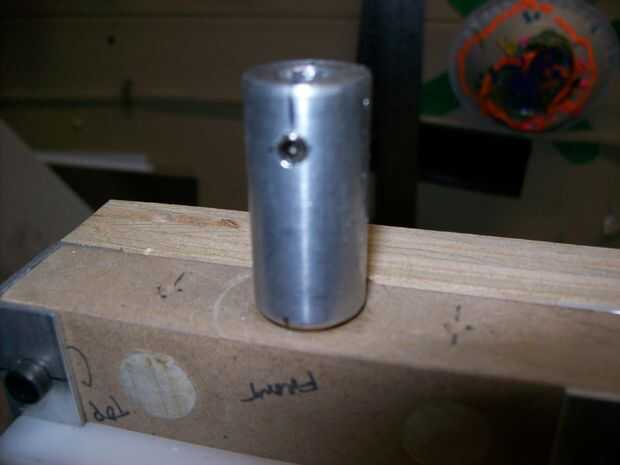 El acoplador del motor es apenas una 5/8" diámetro barra de aluminio con un agujero de 1/4" a través de ella y un par de set tornillos para sujetar el eje del motor de pasos y el tornillo ACME barra de plomo. Nota que la dimensión que se muestra en el dibujo para la longitud del acoplador motor es errónea debe ser 1 1/4" de largo. Usted puede comprar el motor acopladores aquí si no desea hacerlos usted mismo.