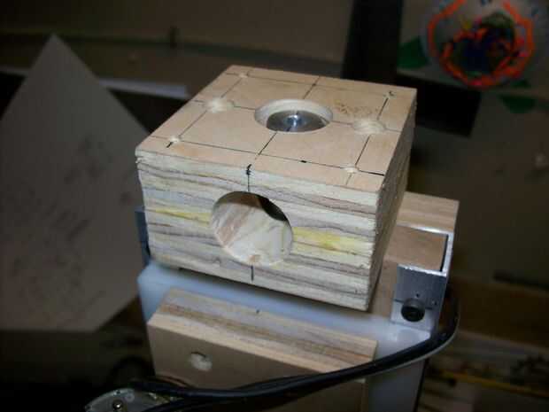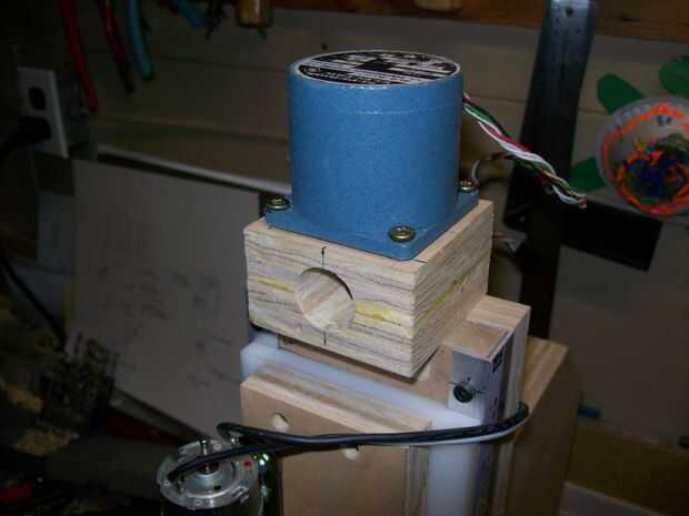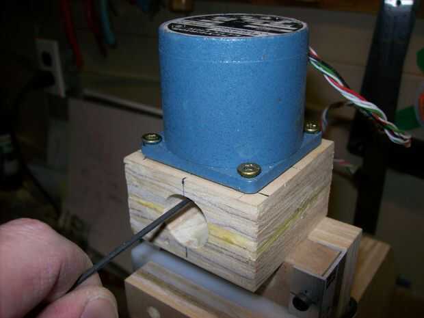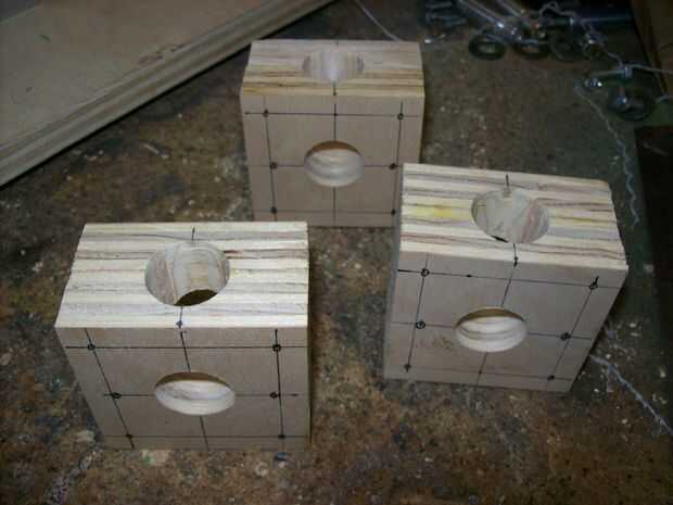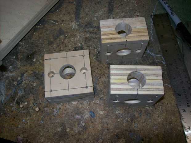 Los montajes son muy simple - sólo dos 7/8 agujeros aburridos a través de ellas usando un Forstner bit: uno (en la vista final del dibujo) es para que el acoplador del motor se deslice a través y el otro es por lo que se pueden apretar los tornillos en el acoplador del motor después de haber montado el motor. Hay cuatro agujeros para montar el motor y un adicional dos orificios para atornillar la bancada al molino.