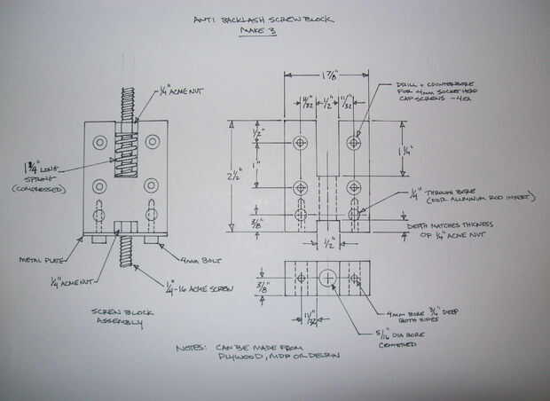 Aquí hay algunos bocetos de las piezas más importantes como una Asamblea detallado dibujo-el dibujo debe ser utilizado como una ayuda de la Asamblea general (muchos de los tornillos quedan fuera el plano para mayor claridad). Muchas de estas dimensiones pueden modificarse para adaptarse a las piezas y materiales que tengas disponibles. Lo más importante es hacer todo como absolutamente cuadrada, recta y plana posible.