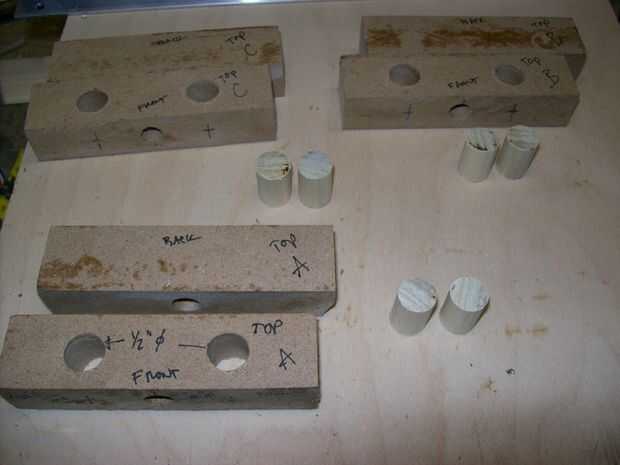 Pegamento 1/2 "x 3/4" largo clavijas en los orificios de las tres piezas. Estas clavijas de madera sirven como anclajes para el montaje que se monta más tarde el motor paso a paso así que si usted no quiere hacer el molino CNC listo que puede dejarlos. Si usted hace los bloques de Delrin entonces no necesita utilizar los rellenos de columnas ya que Delrin tiene los tornillos bien.