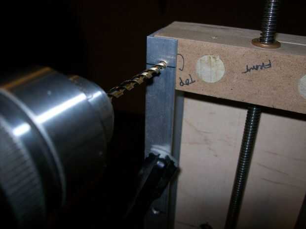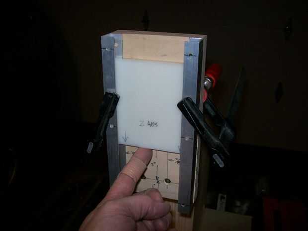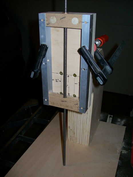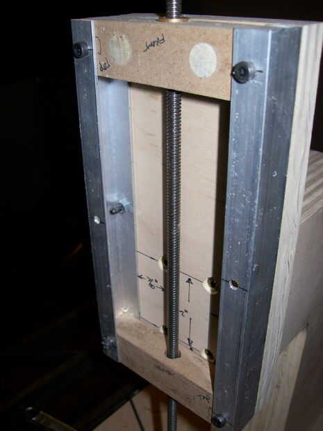Ahora fije los rieles a la madera contrachapada base utilizar la diapositiva de Delrin corte como espaciador. Quitar la corredera de Delrin e inserte los bloques de extremo. Deslice la varilla ACME a través de los bloques para asegurarse de que todo está alineado correctamente y luego perforar los agujeros de los rieles. Inserte cuatro tornillos largos a través de los extremos de los rieles y fijar con tuercas. Ahora inserte un perno más corto de la parte posterior de la base por el agujero central de ferrocarril de madera y fijarlo con una tuerca.