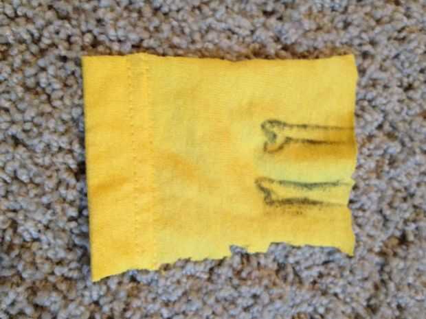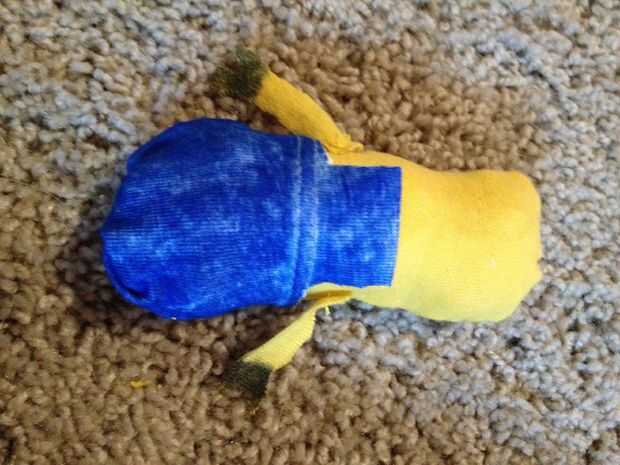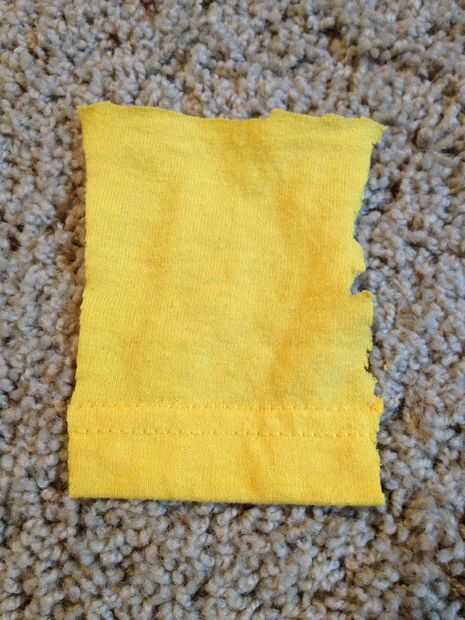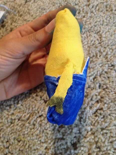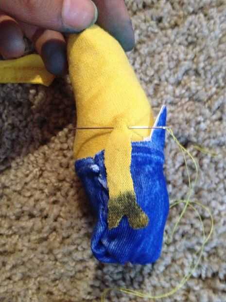 Otra pieza si amarillo tela y cortar las manos y utilizar guantes. Luego coser las manos. Añadir el general correa, cortar una pieza de tela azul y cortar en una línea como la mano y en coser como la mano.