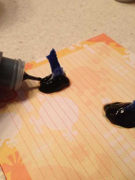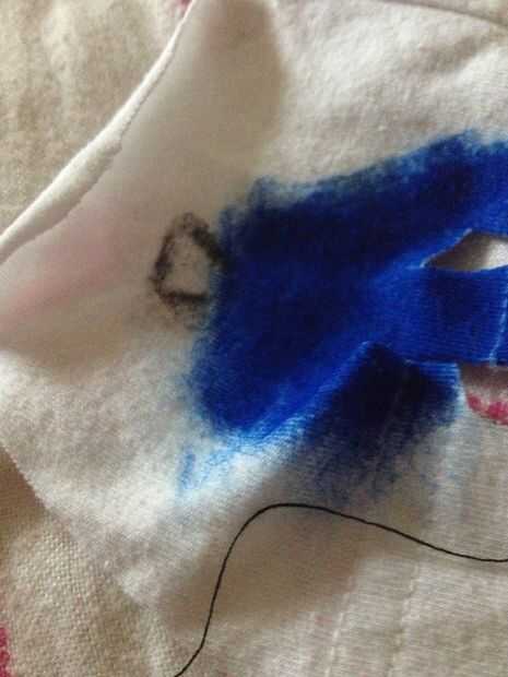 Va a tomar la tela azul y corte en una pierna y zapato. Con la pintura para tela dimensional negro cubra el zapato con la pintura a continuación, esperar que se seque! Luego lo cose en su súbdito!
