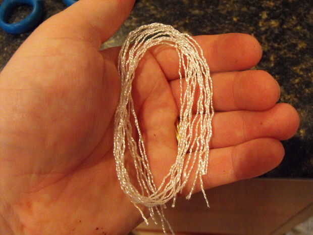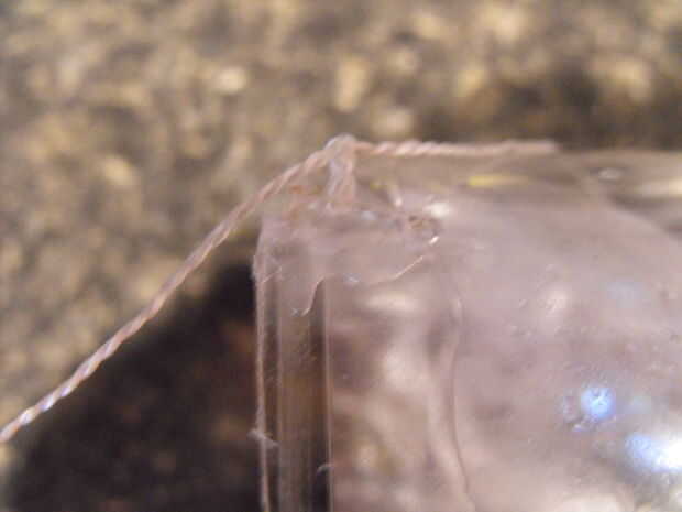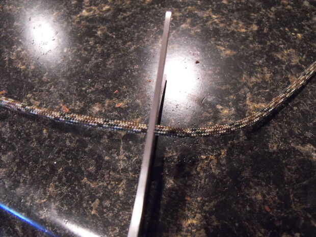 Ahora corte 12" de 550 cable y tire de los hilos interiores 7 (sé paracord también utiliza sólo 5 hilos internos pero la mayoría contains7). Uno de los extremos de los filamentos interiores y luego los peces (perdón por el juego de palabras) desde el filamento a través de los agujeros y atar una puntada quirúrgica (usado sólo 3 nudos cuadrados para lograr esto) para asegurar las dos piezas juntas... también no se menciona en las fuentes, si este método no funciona para usted, entonces es aceptable usar cable (por supuesto será más seguro y sería la opción más favorecida).