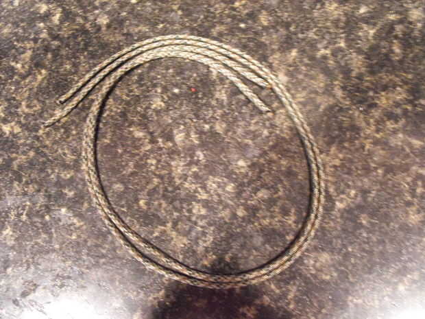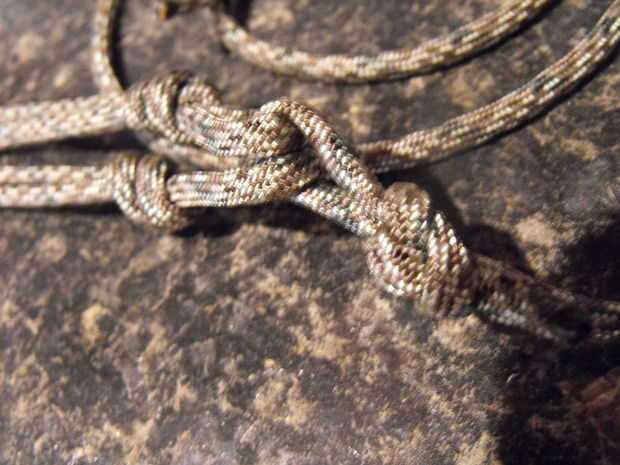 Tomar 48" de 550 cable y cortar por la mitad. Tome las partes insividual y atar un lazo por todo lo alto en cada uno de ellos. Después tome la cuerda restante y atar las dos partes a ella usando el nudo de un arquero (realmente cualquier nudo lazo funciona, pero esto es lo que prefiero).