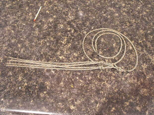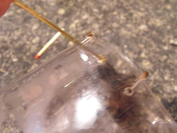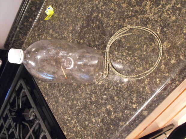 Ahora perpendicular de calor golpe 4 agujeros en la parte inferior de la trampa sobre tan grande en el diámetro como la cuerda de su uso... en mi caso el cable de 550. Luego vas a atar a los cuatro extremos del cable semienterrados a través de los agujeros. Utilicé el nudo de dos medios nudos.