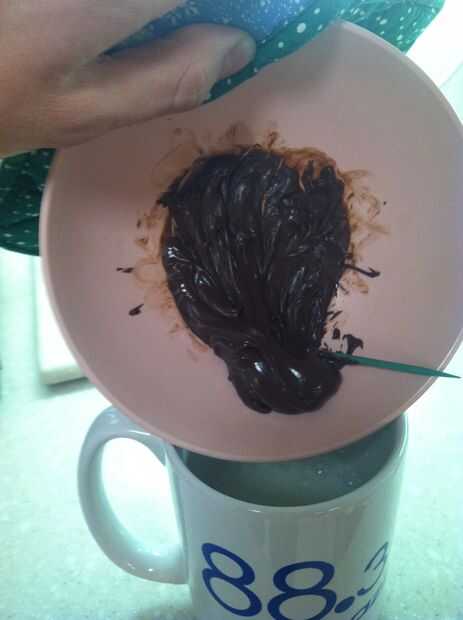 - Utilizando una cuchara o palillo de dientes para ayudarle, al verter de que el chocolate derretido en la taza y el plato lleno vapor leche.