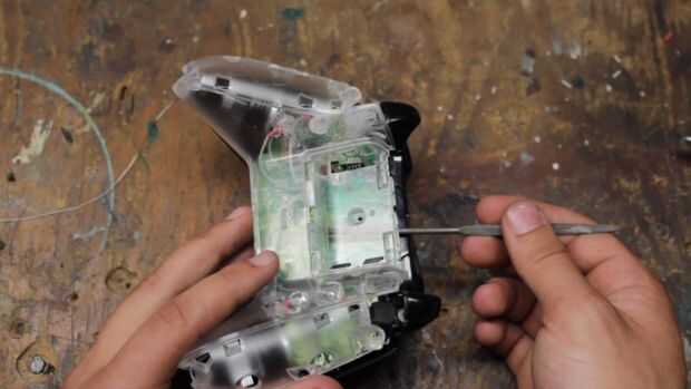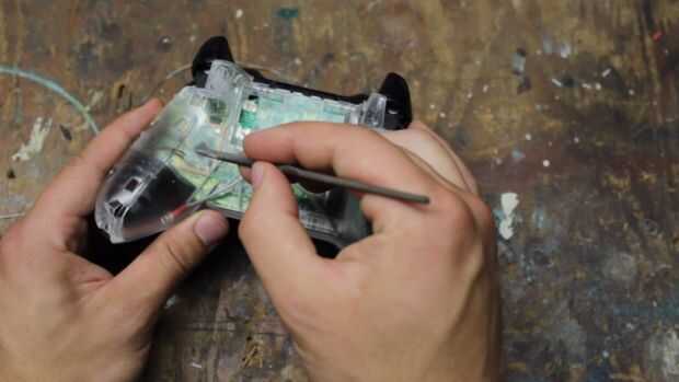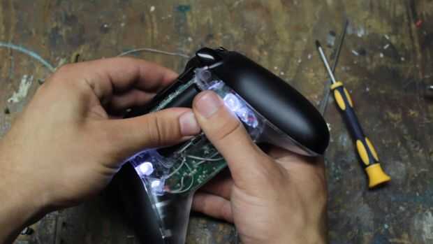 Poner temporalmente el caso en la parte posterior del controlador para ver donde quieras tus LEDs para enfrentar. He marcado los 4 puntos sobre el caso con la punta afilada en mi archivo, pero puede utilizar una aguja o un lápiz. Vamos a utilizar pegamento caliente para fijar los LEDs. Al hacer esto, empecé con los LEDs del lado izquierdo de la caja. Esto hace difícil trabajar en el lado derecho porque los cables eran tan cortos. Así que aprender de mi error y empezar con la derecha LED para hacer más fácil su trabajo. Una vez todo unido al caso, meta los cables hacia la parte inferior y colocar en la parte superior. Atornillar la parte posterior del caso y poner la batería en!