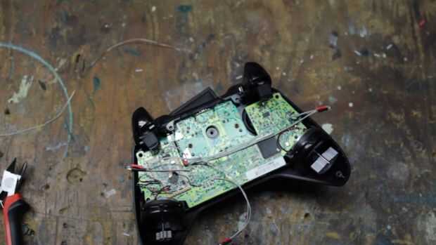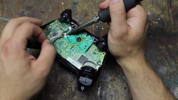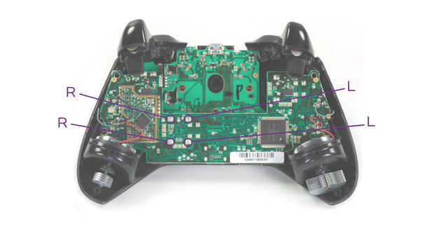Conectar el cable de la resistencia alrededor de la batería positivo (fondo) del diente y luego la soldadura a la Junta. Tuve que tomar un destornillador y pulsado el plomo mientras que la soldadura haya enfriado. Resto de los conductores de los cables negativos de los LEDs van a fijarse a los cojines de suelo para la palanca de control derecha. Mire el diagrama que he incluido en las fotos. Mantener los LEDs con los cables más cortos en el lado izquierdo porque están más cercanos de la batería terminal.