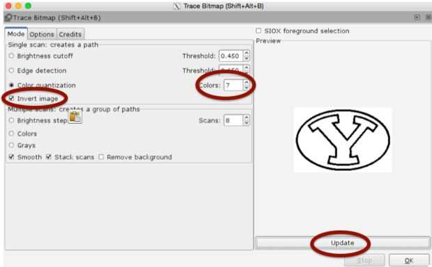 2. Cambiar los umbrales de cómo determina crear la ruta de acceso. Puede presionar "Actualizar" para ver el camino. Sólo presione "OK" una vez que crea un trazado. Una vez que usted presione Aceptar, luego cierre la ventana. Encontré que cambiando los "colores" a menos de 8 útiles así como "Cuantización de Color" y "Invertir imagen"