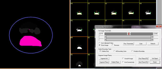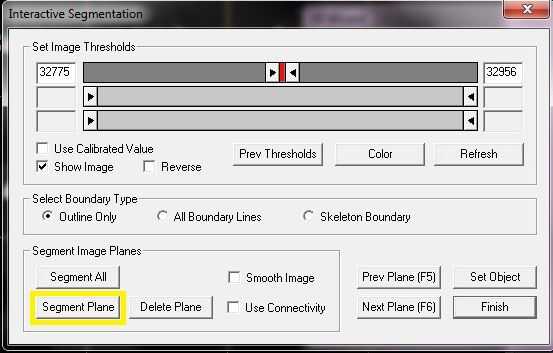 Una vez que estés satisfecho con las zonas resaltadas, haga clic en "Segmento plano" para la imagen del segmento. Navegar entre imagen planos (usar F5 y F6)y segmentar cada plano que contiene el objeto seleccionado.