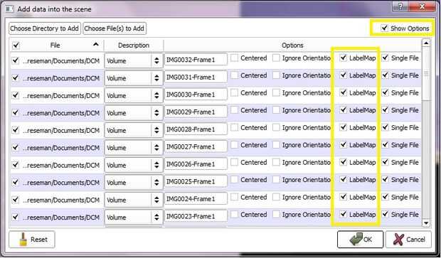 En la ventana "Agregar datos en la escena", seleccione "Mostrar opciones" y busque "LabelMap" de cada archivo. Golpear OK.