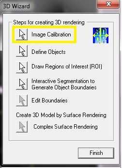Seleccione "Calibración de la imagen" desde el Asistente de 3D. Aparecerá un cuadro de diálogo con opciones para voxels y rebanada grueso. Valores predeterminados se llena, ya que los archivos DICOM contienen parte de esta información, pero se puede ajustar según sea necesario.