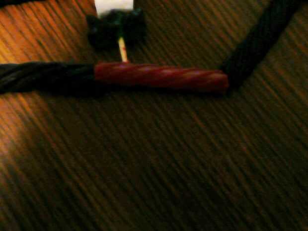 Corte un trozo de cadena de aproximadamente 3 pulgadas más de largo que quieras el modelo que. Envuélvalo con cinta adhesiva un extremo (para mantener el regaliz de caerse). La secuencia de alternar colores de regaliz. Al llegar a la longitud deseada, acabado con cinta de enmascarar. Repetir con una pieza más de la cadena, asegurándose de que las longitudes son iguales. Deben coincidir con los colores de regaliz (ex: rojo, negro, rojo, negro, etc..).