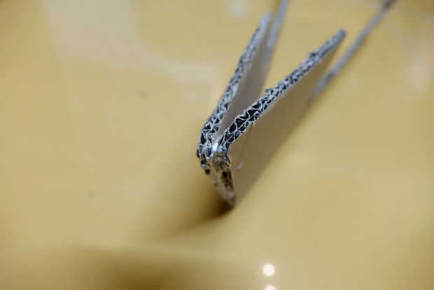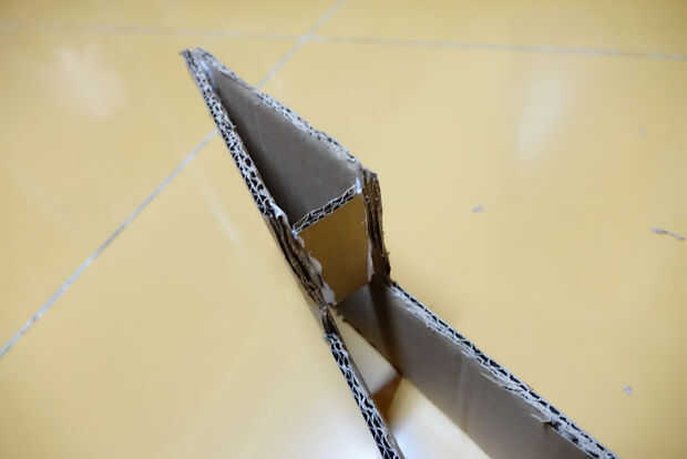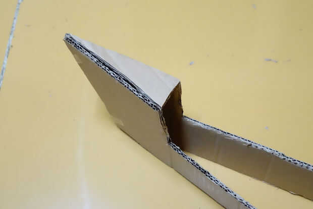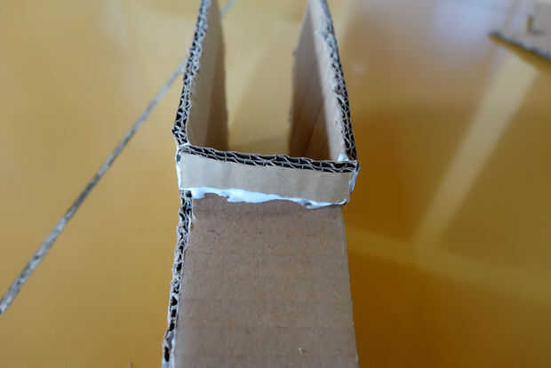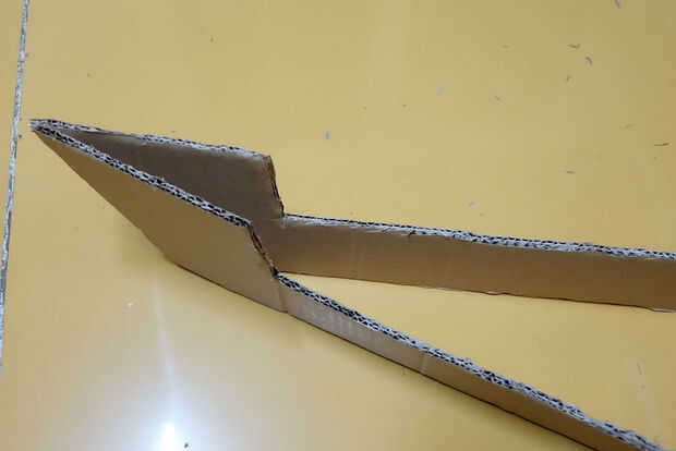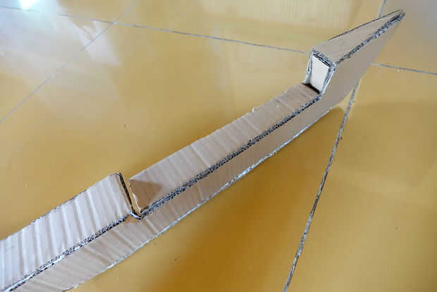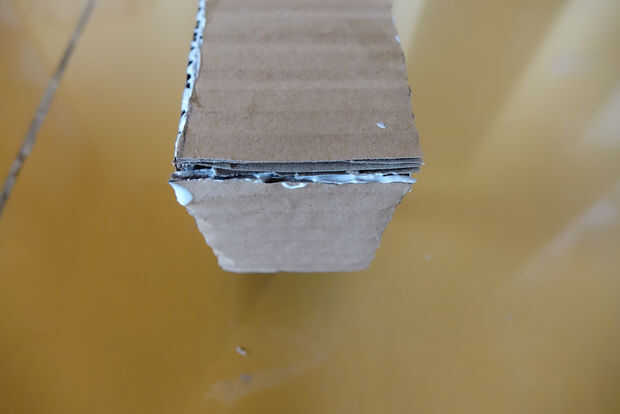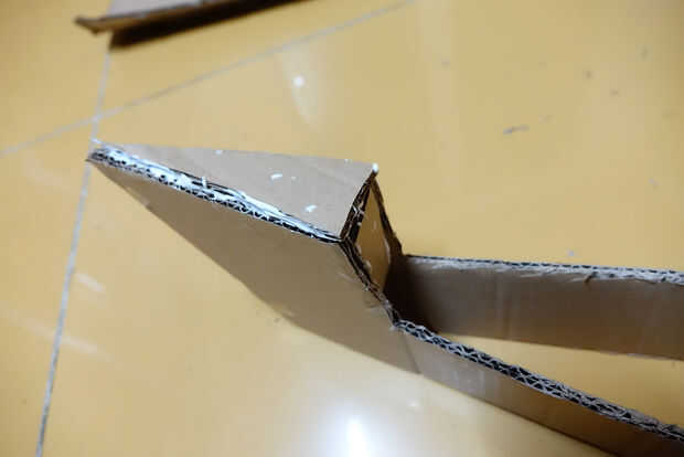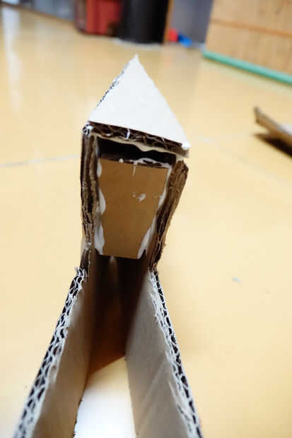 Cuando el pegamento se haya secado mucho, mira el triángulo formado por las dos puntas y... bien, ver imagen de referencia. Cortar una pieza ligeramente más delgado que este triángulo (haga el menor ángulo más pequeño de unos 2 grados). El lado más pequeño debe ser unos 4 cm. no pegar esto todavía (sí, va en el triángulo en la imagen).