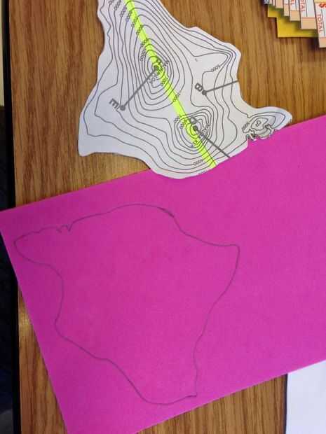 Ahora, mire nuevamente su mapa y corte esa primera línea que trazó para que tú ahora tienes un esquema del contorno 2ª línea de la parte inferior. Seguimiento de esto en un pedazo de la sustancia que está utilizando. y córtelo hacia fuera así que ahora tienes 2 capas de corte.