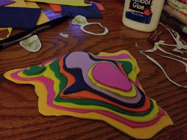 Continuará a corte, rastro y pegamento en su 3D modelo de aquí encendido hacia fuera! Cada una de mis capas hice diferentes colores así que estaban parados hacia fuera. Tuve 2, realmente 3, colinas de mi mapa topo así que había que asegurarse de mantener las partes de los mapas para agregar más adelante. Ver el siguiente paso de cómo hacer!