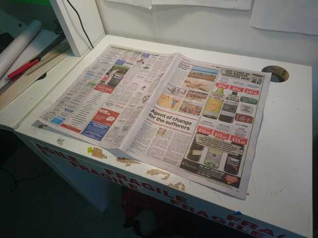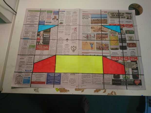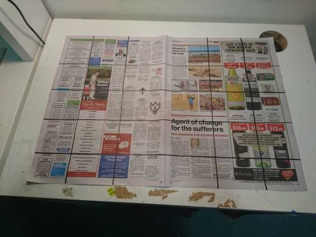 Use pegamento para pegar las imágenes en las zonas deseadas después marcándolas hacia fuera en el periódico, mediante la reducción de una (550mm / 21.7 en 385 mm / 15.2 en) rectángulo, medir y marcar un área de 220 mm / 8.7 de ancho, 65 mm / 2.6 en el fondo en el centro del papel hará más fácil posicionar la imagen en el lugar correcto
