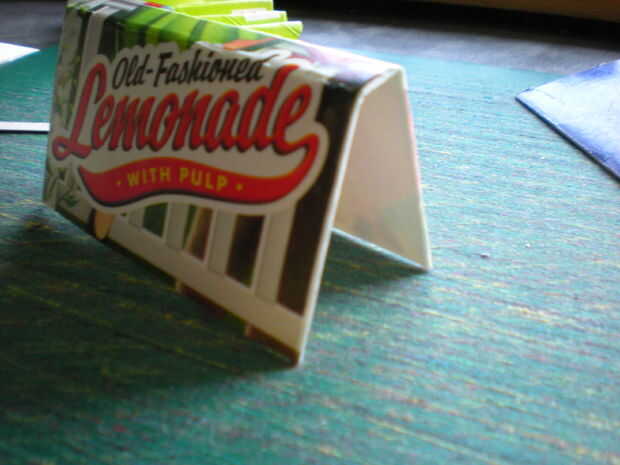 Ahora, yo suelo utilizar la parte de la caja de cartón que cortamos en el paso dos ya que es la parte delantera de la caja de cartón y generalmente lo más interesante. También, es la parte que está en inglés (canadiense bilingüe etiquetado). Yo corte a cerca de cuatro y media pulgadas de longitud y tiene el mismo ancho que el cartón es normalmente, por lo que no necesitará cortar los lados. Ahora, dos pulgadas hacia arriba desde la parte inferior, realizar un doblez. Medida otro centímetro de eso y hacer otra doblez. Debe buscar algo así como una cubierta de libro ahora.