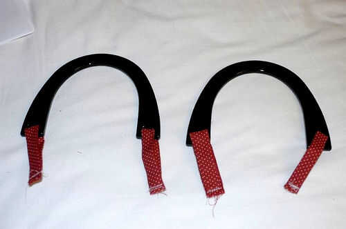 Si usted está haciendo un embrague, puede saltarse este paso y vaya a paso 5.  Si quieres un bolso, este es el momento de sacar las manijas del bolso.  Puede comprar bolso asas en muchos lugares hoy en día.  Buscalo en google se.  Estos mangos que tengo aquí, cada uno tiene una ranura pequeña para atar a un monedero.  Las manijas de la bolsa podrían ser totalmente diferentes, así que tienes que ser creativo por ti mismo aquí. Pero la idea básica es utilizar algunos de la tela para crear correas para sujetar las manijas en el interior del libro.
