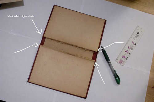 Salir un pedazo grande de papel, o simplemente cinta adhesiva dos juntos como he hecho aquí half-assedly.  Seguimiento de la portada de su libro sobre un pedazo grande de papel, asegurándose de marcar ambos extremos de la espina dorsal del libro en su papel.