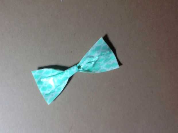 Doblar sus rectángulos en mitad del camino corto. Cortar una forma triangular muy delgada de los lados, con las fotos como guía. La forma de despliegue y aplasta hasta la mitad del mismo, por lo que se ve como un arco. Envuelva una tira delgada de cinta alrededor de la mitad hasta el final.