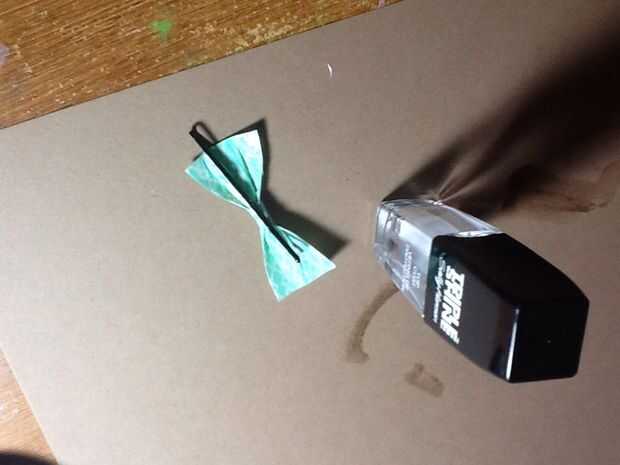 Ahora vamos a colocar la horquilla. Coloque el lado plano dentro del bucle que hiciste con la fina tira de la cinta. Luego agarra su cola o polaco y frote un poquito en cada lado del lazo. Tenga cuidado de no unir el pin!