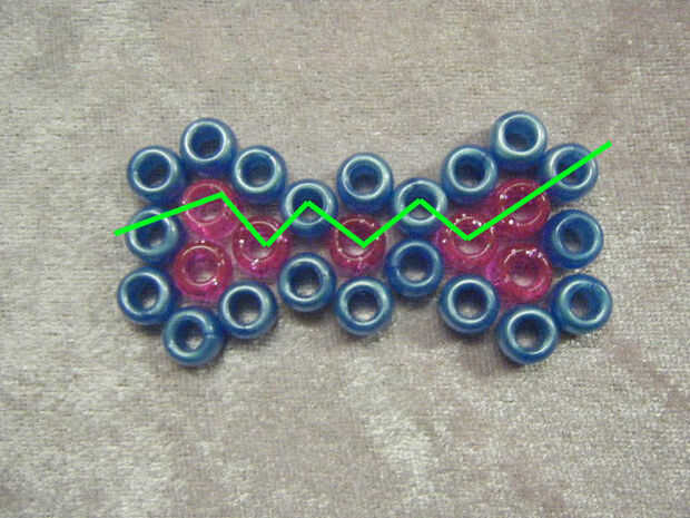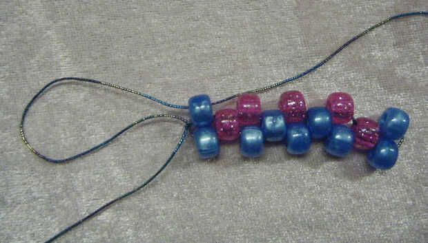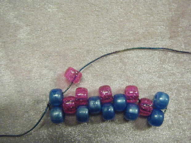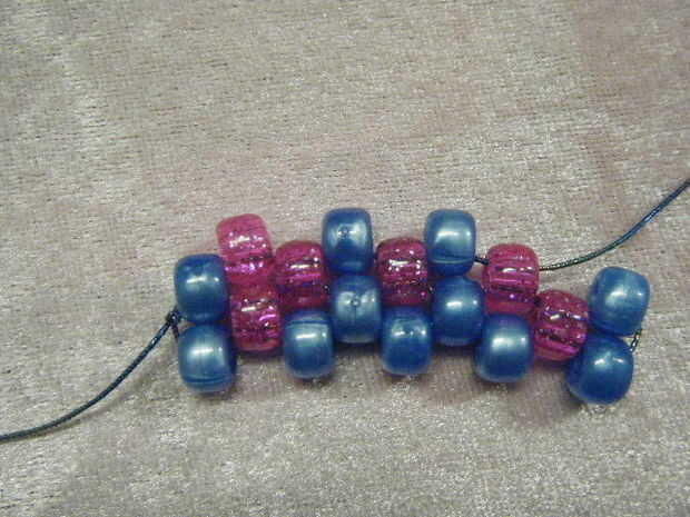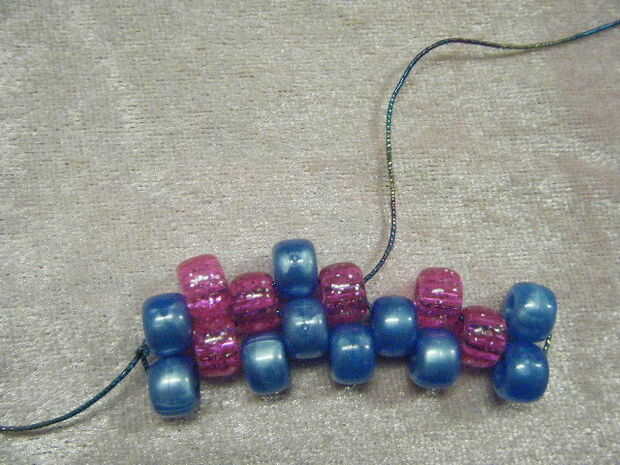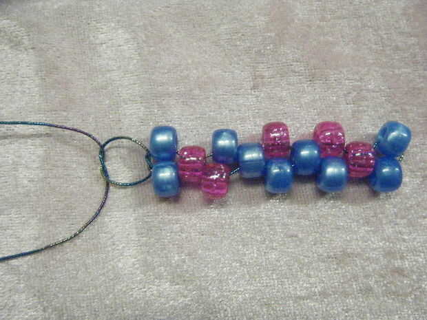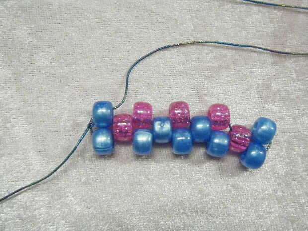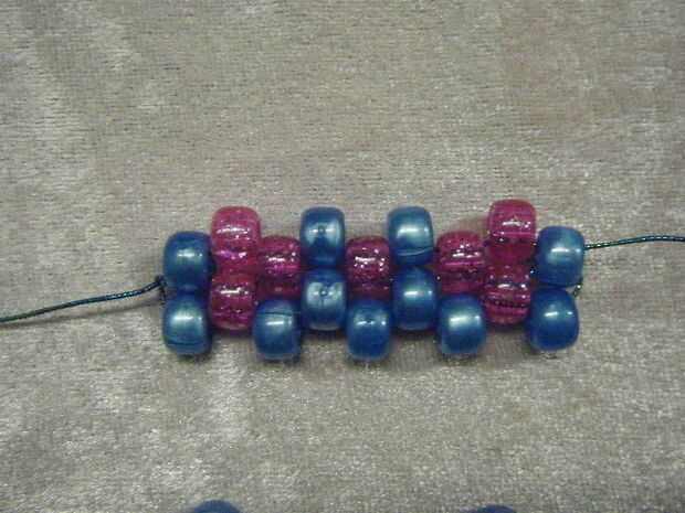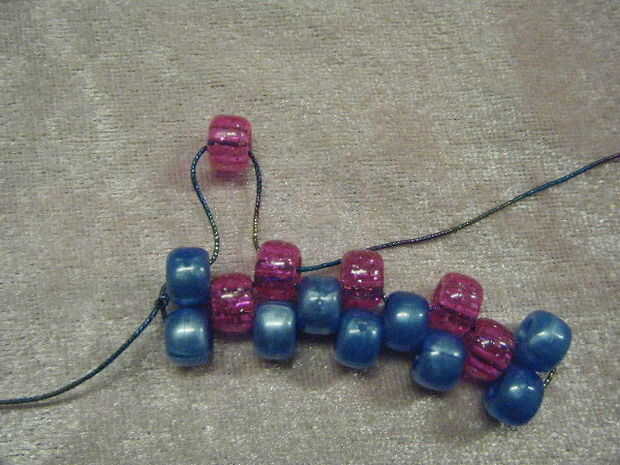 Ate un nudo cuadrado regular y bucle el grano pasado encadenado en. Ahora vamos para alternar entre añadir granos y enhebrar la cuerda a través de la hilera anterior para mantenerlos en su lugar.