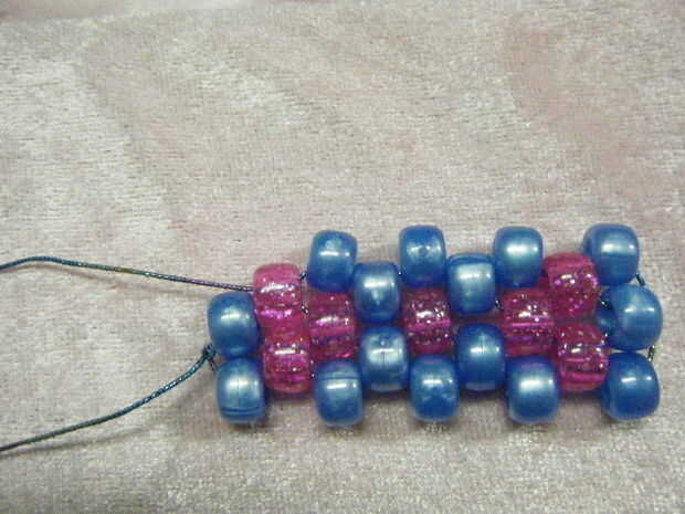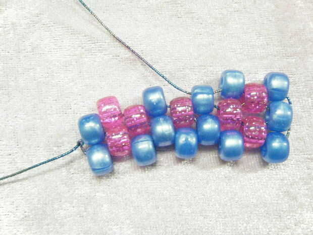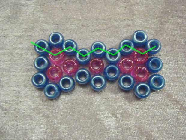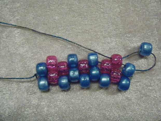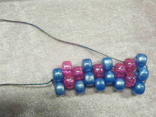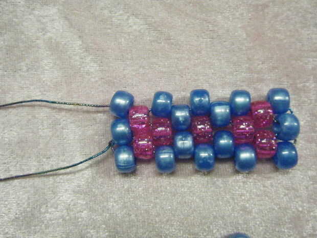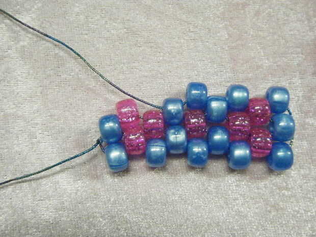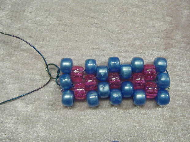 Añadir otro grano y cadena a través de los últimos te encadenan en grano. Continuar abalorios hasta llegar al final de esta fila.